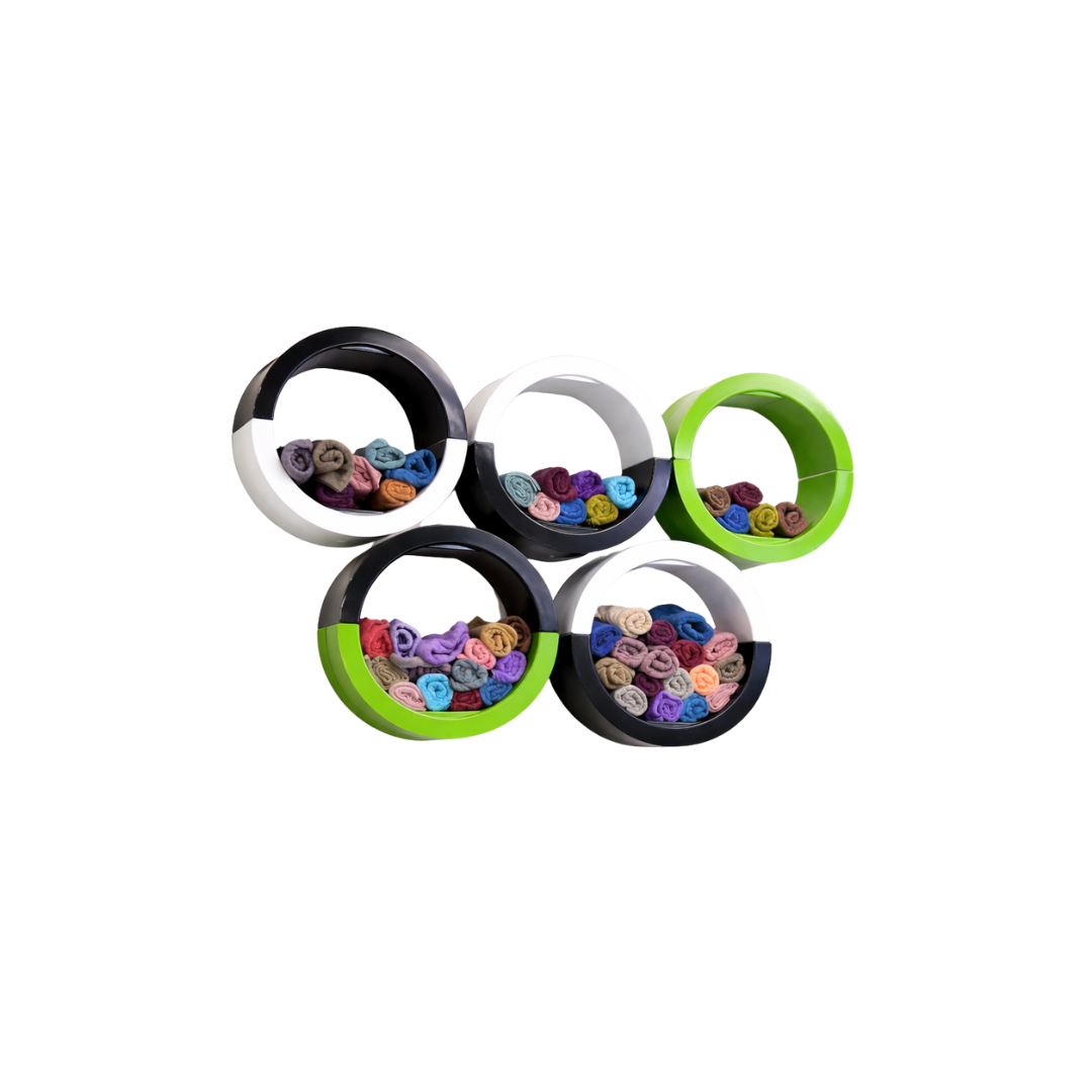 Moderne zidne kružne police u kombinaciji crne, bele i zelene boje, idealne za odlaganje peškira i dekoraciju frizerskih i beauty salona.